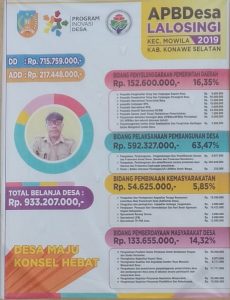 LintasIndoNews.com | ANDOOLO, Pemerintah Desa lalosingi Kecamatan Mowila Kabupaten Konawe Selatan, program Dana Desa (DD) yang bersumber dari APBN , tahap pertama dan kedua tahun 2019 ini, dari anggaran APBN sudah direalisasikan bahkan sudah di manfaatkan untuk pemberdayaan Desa Lalosingi.