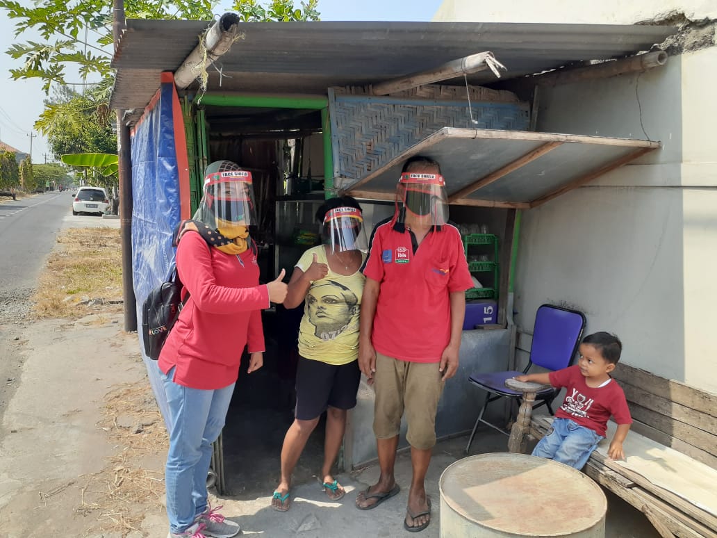 Melalui Kepala Perumda Air Minum Tirta Ampera Ibu Kota Kecamatan (IKK) Sawit Boyolali Joko Santoso SE beserta Istri selaku Dharma Wanita Perumda Air Minum Boyolali Indri Indah Permatasari AM.d, adakan kegiatan berbagi ratusan masker Face Shield dan Hand Sanitizer kepada para pedagang kaki lima .