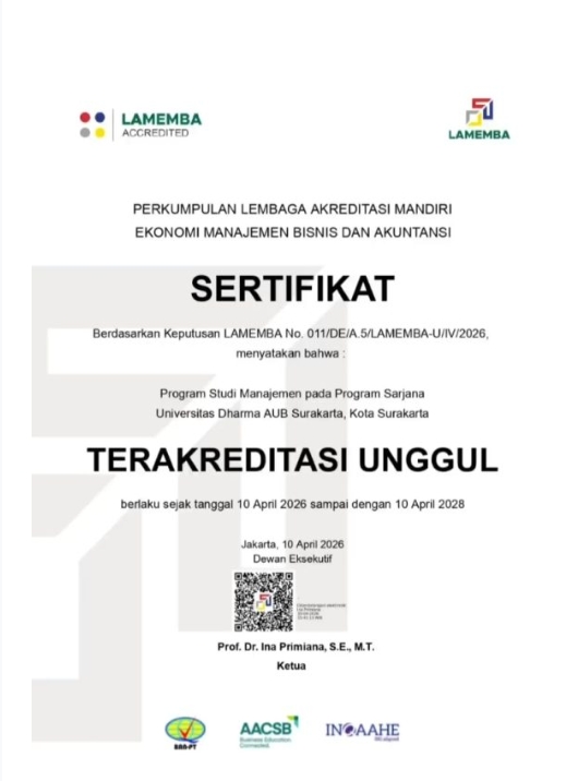 Surakarta, 16 April 2026 – Kabar membanggakan datang dari dunia pendidikan tinggi di Kota Solo. Program Studi (Prodi) Manajemen jenjang Sarjana milik Universitas Dharma AUB Surakarta resmi meraih akreditasi tertinggi “Unggul” dari LAMEMBA.Penetapan tersebut tertuang dalam Keputusan LAMEMBA Nomor 011/DE/A.5/LAMEMBA-U/IV/2026 yang berlaku mulai 10 April 2026 hingga 10 April 2028.