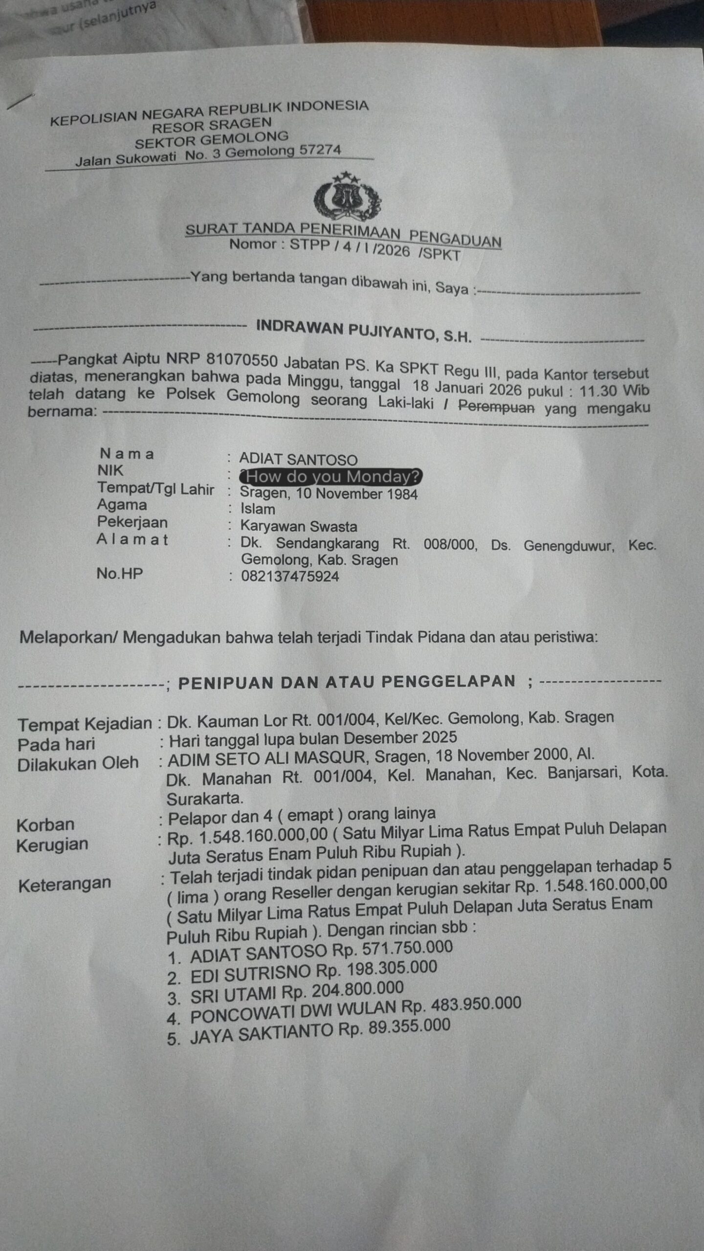 Berdasarkan Surat Tanda Penerimaan Pengaduan (STPP) Nomor: STPP/4/I/2026/SPKT, pelapor atas nama Adiat Santoso mewakili para korban melaporkan dugaan tindak pidana penipuan dan/atau penggelapan yang diduga dilakukan oleh Adim Seto Ali Masqur.