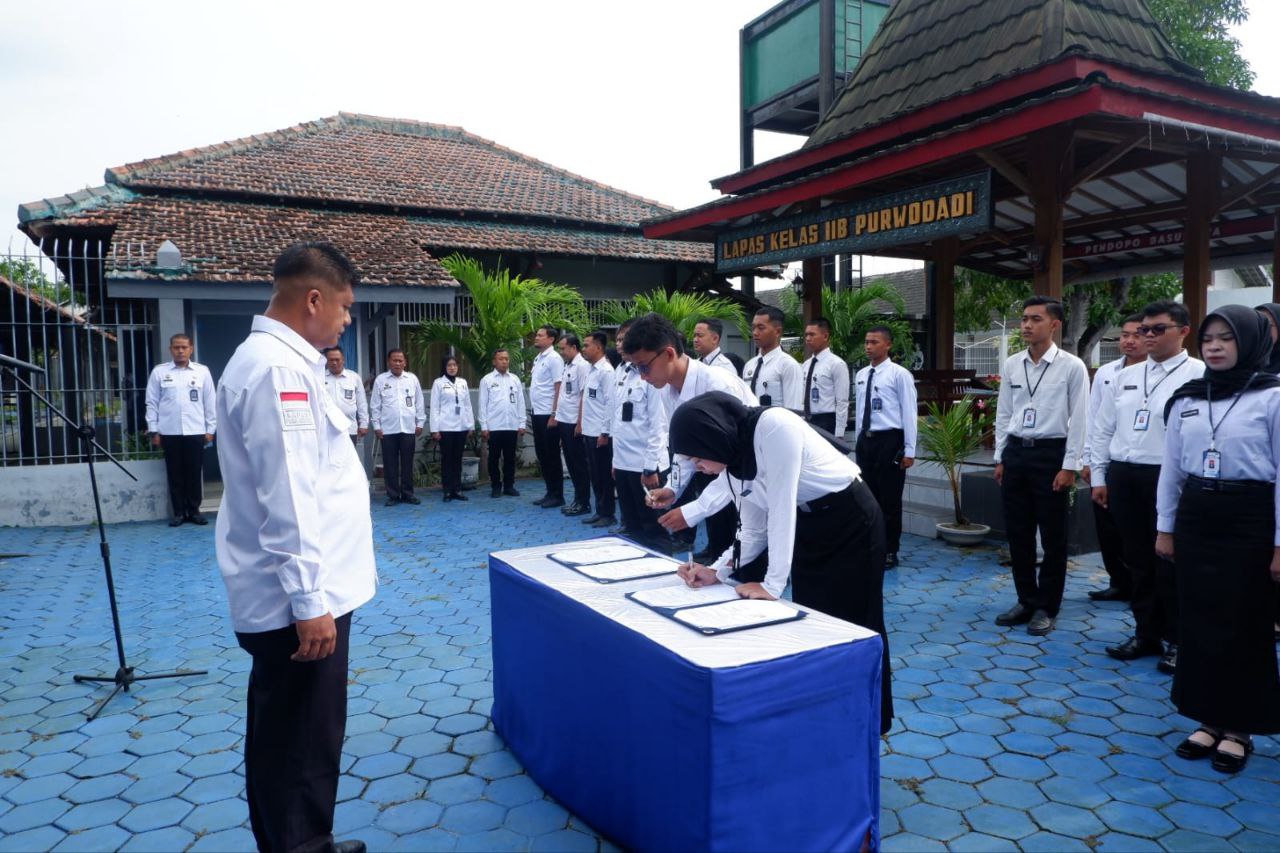 GROBOGAN – Lembaga Pemasyarakatan (Lapas) Kelas IIB Purwodadi melaksanakan apel pagi pegawai yang dilanjutkan dengan penandatanganan perjanjian pemagangan, Rabu (26/11/2025). Sebanyak 21 tenaga magang resmi mengikuti kegiatan yang dimulai pukul 08.00 WIB dan dihadiri seluruh Pejabat Struktural, staf, CPNS, hingga peserta magang.